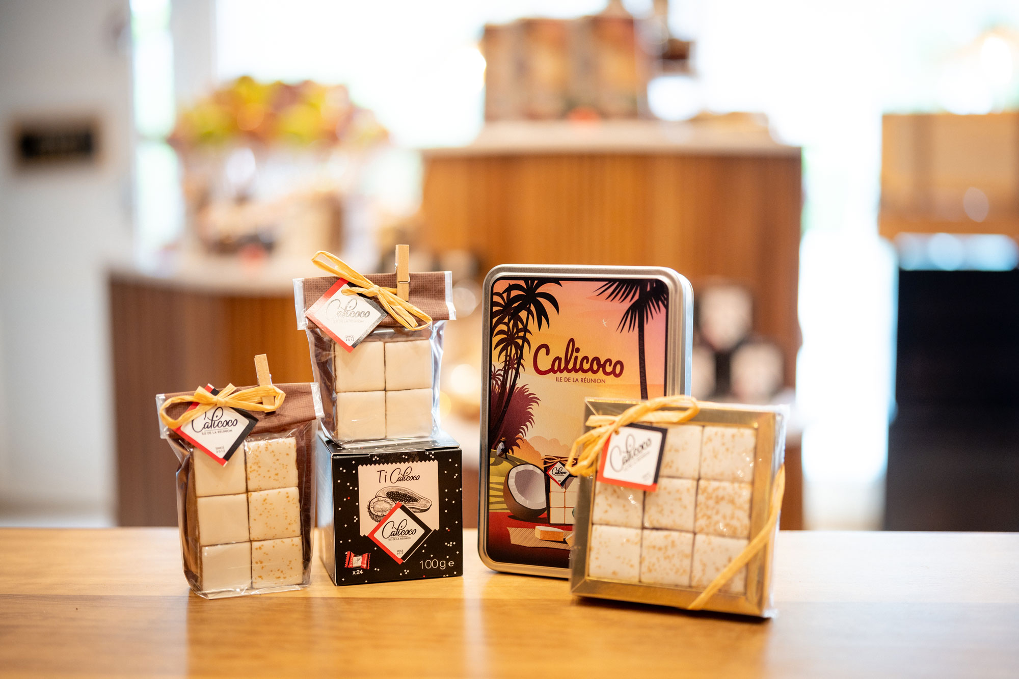 La gamme Calicoco présente différents packagings tous plus soignés et élégants, qu'on aime offrir et recevoir. La confiserie tient compte de l'impact environnemental de ses emballage, c'est pourquoi les calicocos individuels sont emballés dans de la cellulose, une matière naturelle biodégradable et compostable, saine pour la planète et la santé des consommateurs. cette démarche a été saluée par les entreprises locales, d'ailleurs, les plus grands Hôtels de l'île proposent des calicocos à leurs clients les plus exigeants.