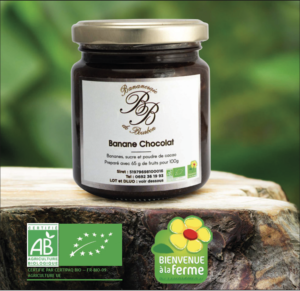 Banana Chocolate Jam CONFITURE DE BANANES CHOCOLAT Une excellente association gourmande de la banane et du chocolat, une sensation qu'on connaît tous, cette confiture nous ramène à notre enfance, un plaisir en bouche.