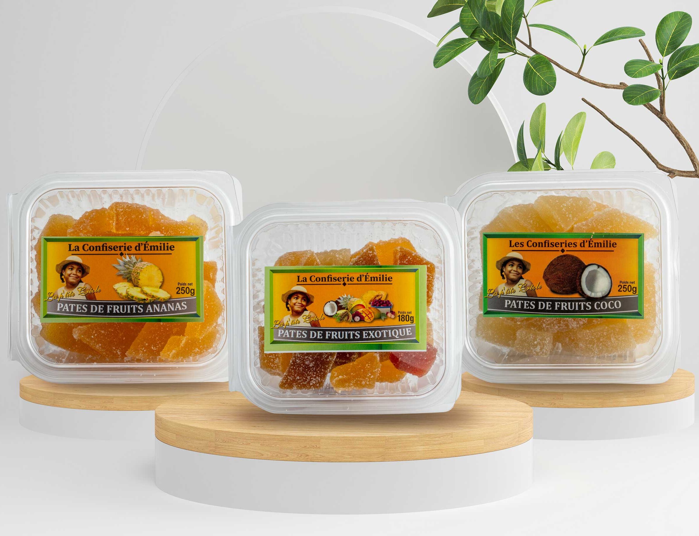 fruit pastes Pâtes de fruit Pâtes de fruit artisanale. Nos pâtes de fruit sont faites à base de fruit, sucre, eau, pectine de pomme ET C'EST TOUT. Pas de conservateur. Ils sont disponibles aux saveurs d'ananas, coco ou exotique.