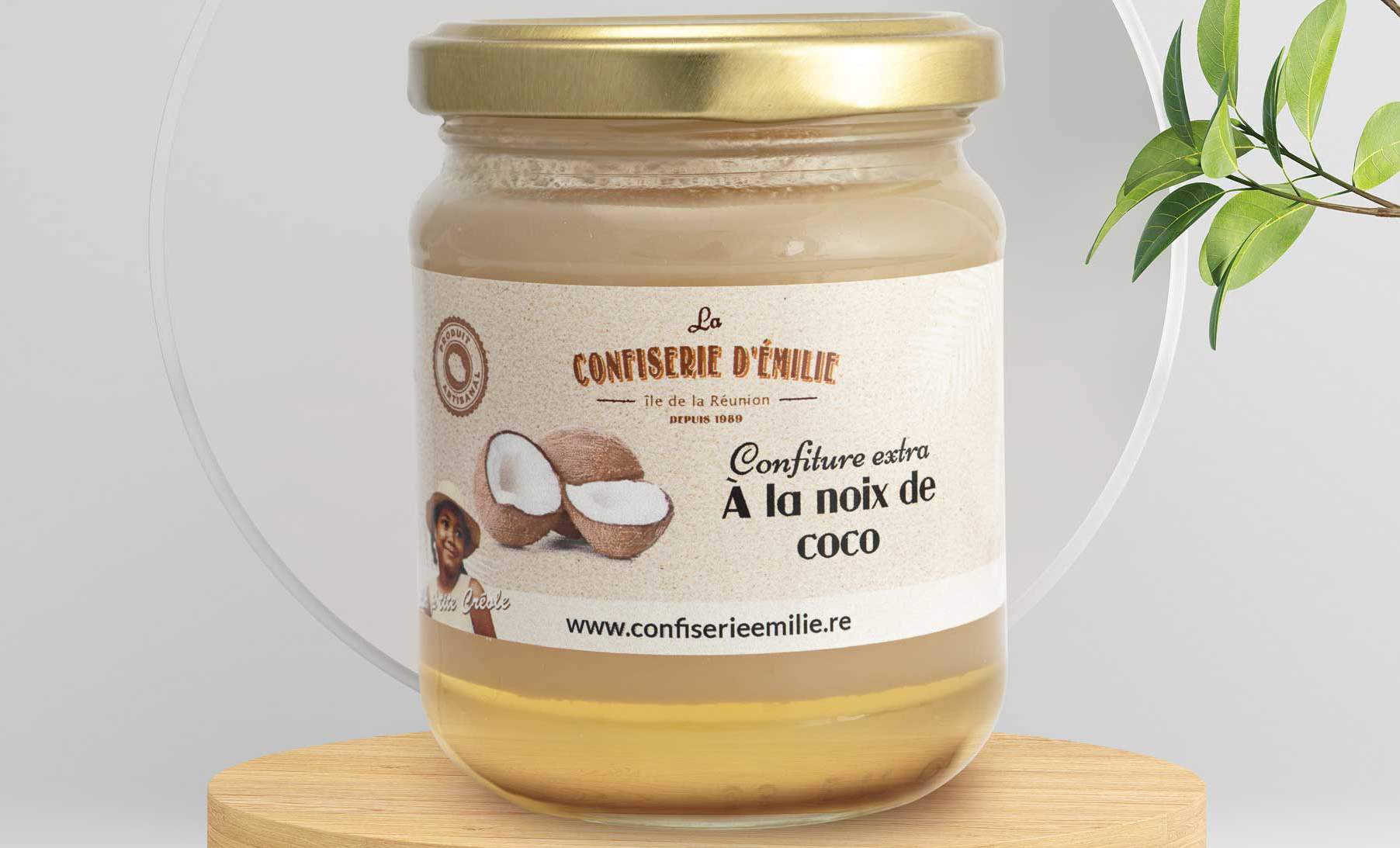 coconut fine jam Confiture extra À la noix de coco Onctueuse et crémeuse, la confiture de Noix de coco de La Confiserie d'Émilie vous transportera sur une plage tropicale à chaque bouchée.