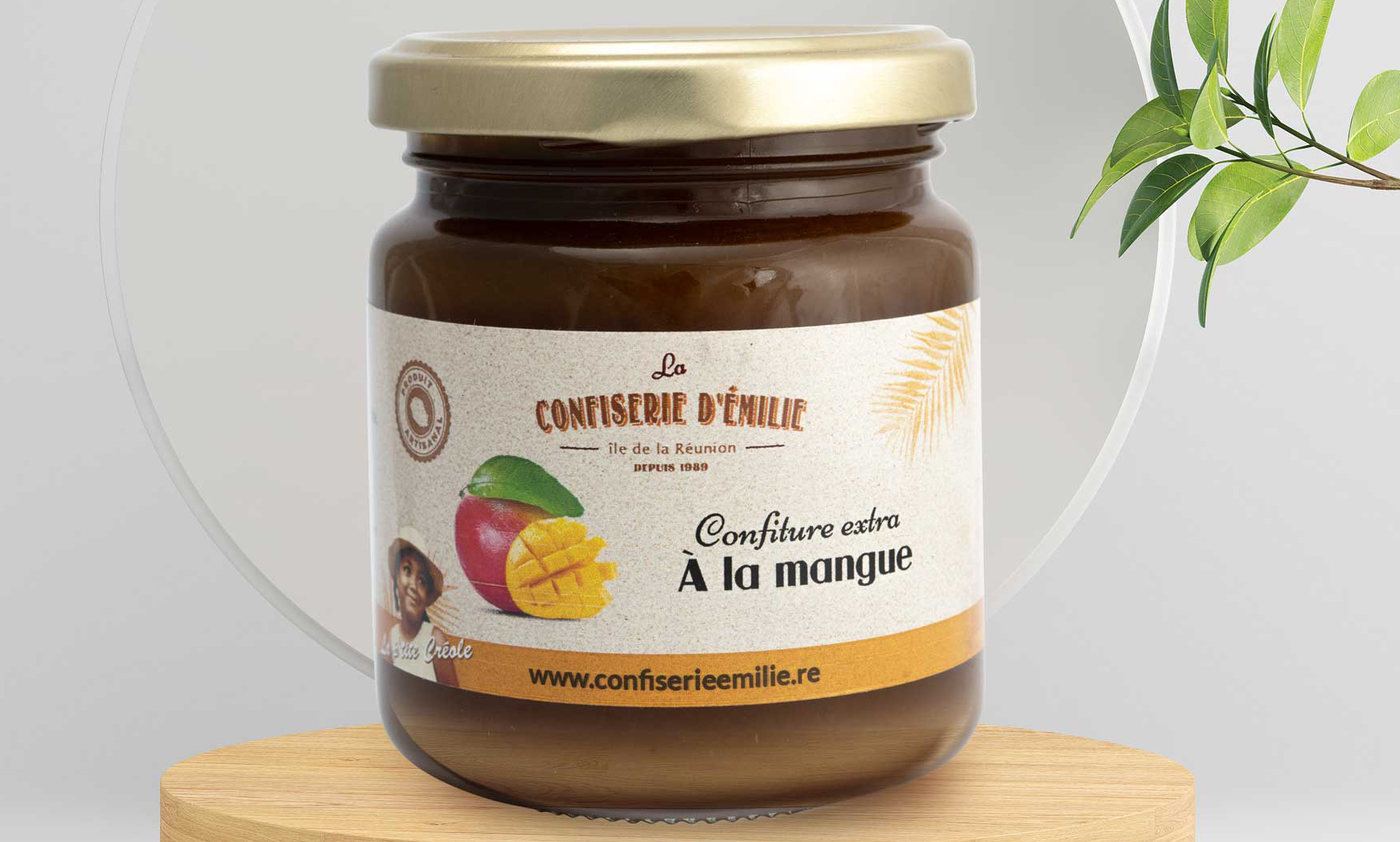 Mango fine jam Confiture extra À la mangue Délicieusement exotique, la confiture de Mangue de La confiserie d'Émilie est un régal tropical à savourer tartinée ou à la cuillère pour une évasion gustative.